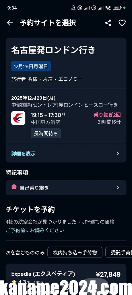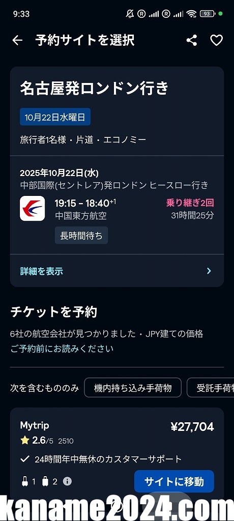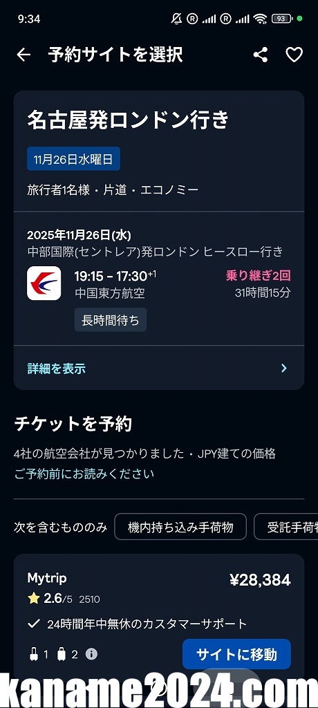 名古屋 → 西安 | 中国東方航空 | 約5時間 |