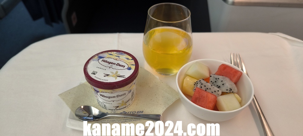そして到着前の軽食タイムには、ハーゲンダッツのバニラアイスとカットフルーツの盛り合わせが提供されました。ハーゲンダッツは鉄板の美味しさで、食後の口直しにもぴったり。フルーツはメロン、すいか、ドラゴンフルーツなど、種類も彩りも豊かでした。
