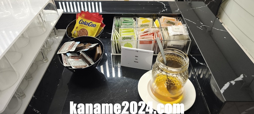 ドリンクはフードに比べて種類が豊富で、ラウンジとしての満足度を上げてくれるポイントでした。コーヒーマシンではエスプレッソ・カプチーノ・ラテが抽出可能で、豆の香りも悪くなく、朝の一杯としては十分なクオリティです。紅茶は数種類のティーバッグがあり、ハーブティー、アールグレイなどを選ぶことができました。
