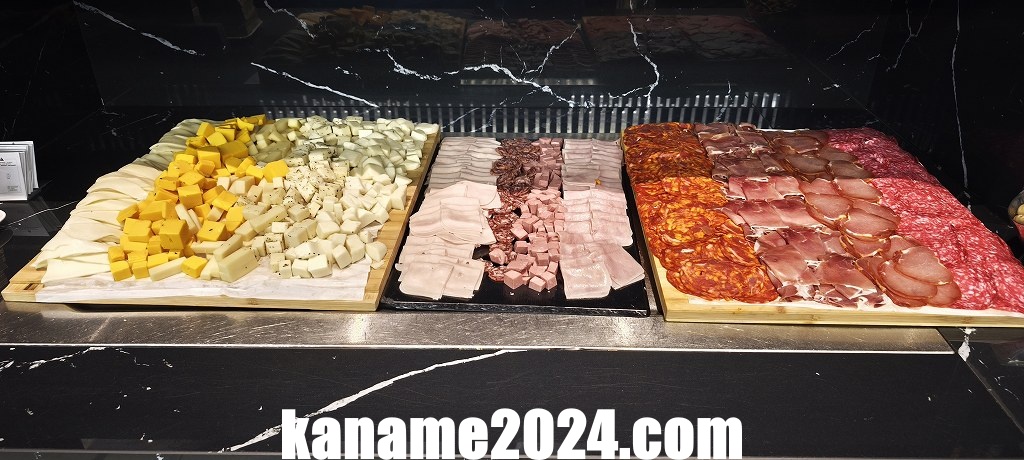 朝の開店と同時に入ったため、ブッフェ台はまだ完全に揃っておらず、料理ラインナップはやや寂しい印象です。用意されていたのは、パン・クロワッサンなどのペストリー類、数種類のチーズとハム、生野菜、そしてカットフルーツ。温かい料理は見当たらず、朝は軽食中心の構成でした。