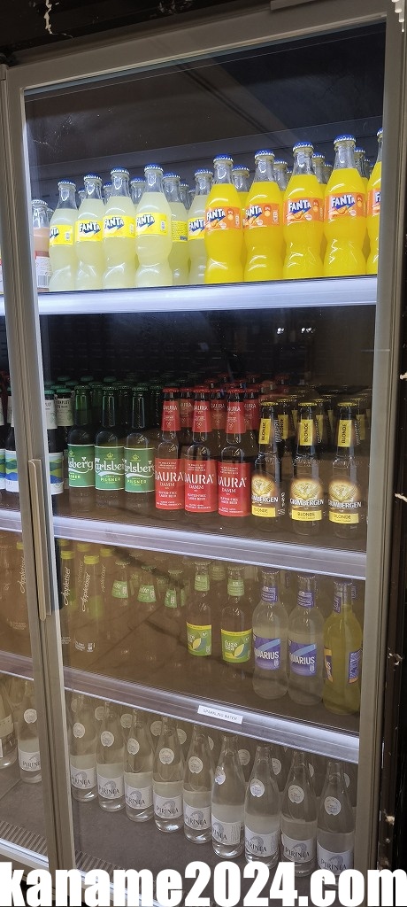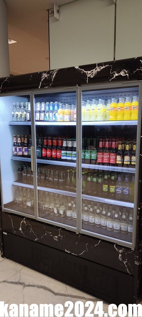 冷蔵ショーケースにはミネラルウォーター、炭酸飲料、オレンジジュースなどのジュース類が整っていました。
