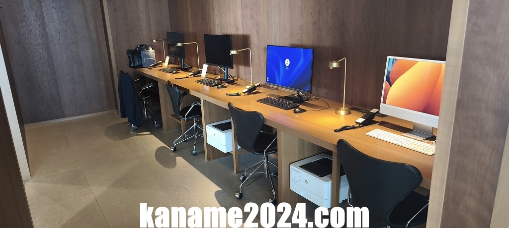 ラウンジ内には The Bureau(作業スペース) が設けられており、コンピュータやプリンターといった機器が利用可能です。USBポートや電源ソケットも適所に配置されており、ノートパソコン作業やプリントアウトが必要なビジネス利用者に配慮されています。