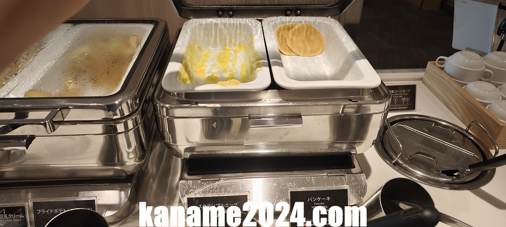 そのほかにも、唐揚げや焼きそば、卵料理、パンやサラダなどの軽食が用意されており、しっかり食事をしたい人から小腹を満たしたい人まで幅広く対応できるラインナップです。朝の時間帯には、スクランブルエッグやソーセージといった洋朝食スタイルのメニューが並んでいました。