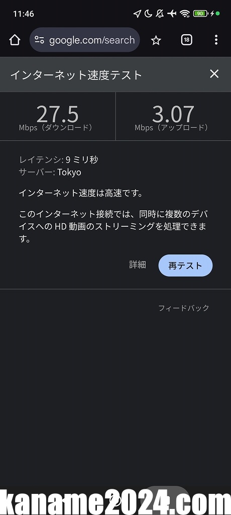 ダウンロード 27.5Mbps、アップロード 3Mbps