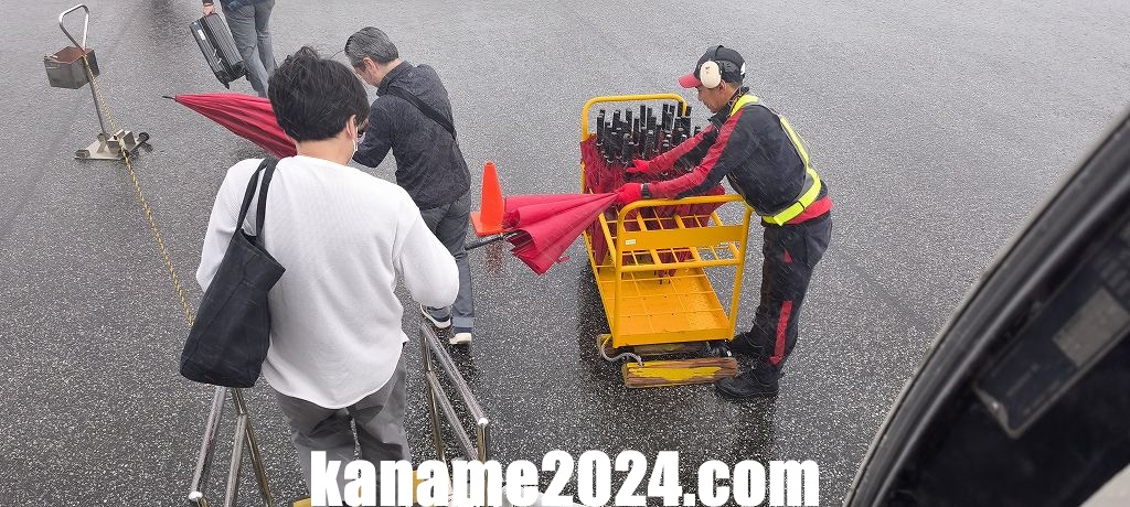 「雨で滑りやすくなっていますので、足元にご注意ください」