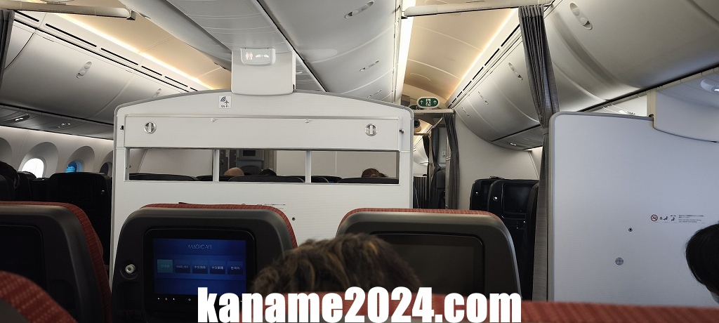 B787といえば多くの航空会社が3-3-3の9列仕様だけど、JALは2-4-2の8列配列。