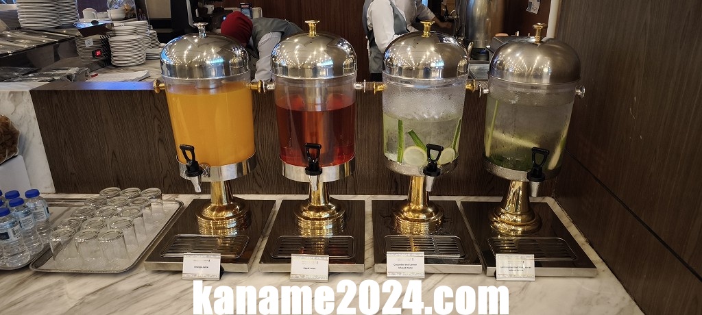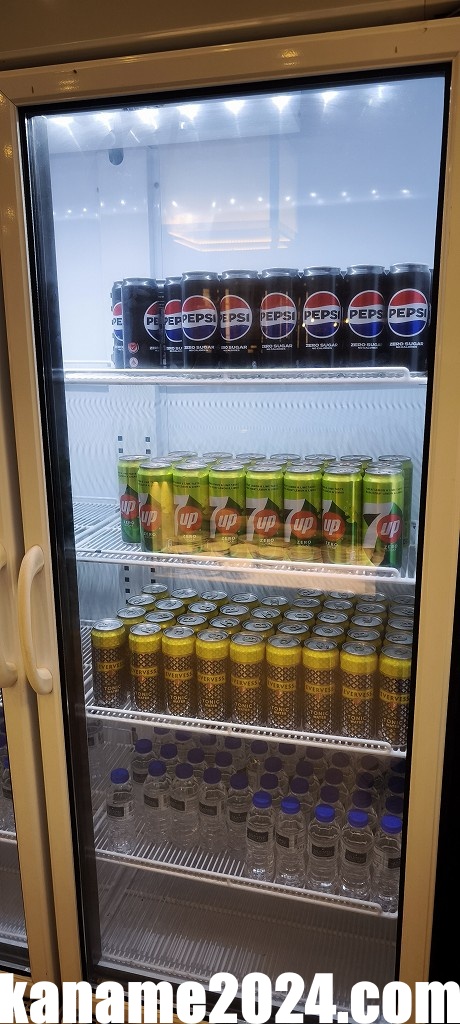 - ビュッフェエリアの冷蔵庫には ペプシ、7-Up、シュウェップス、ミネラルウォーター などの炭酸飲料が常備され、自由に取れる形式。