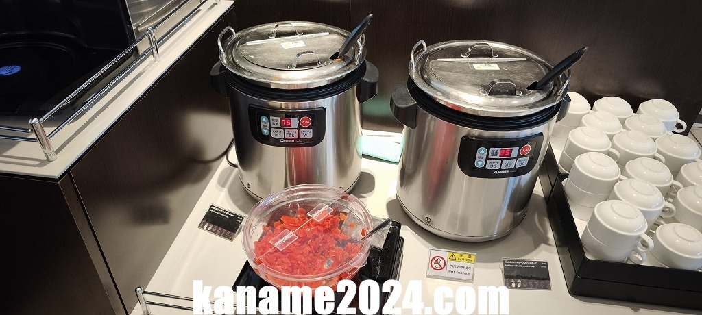 また、セルフサービスのビュッフェエリアには、ANAラウンジ特製チキンカレーを始め、朝の時間帯には和洋の朝食メニューが揃っており、パンや卵料理、サラダ、特製ビーフスープやご飯なども選べます。
