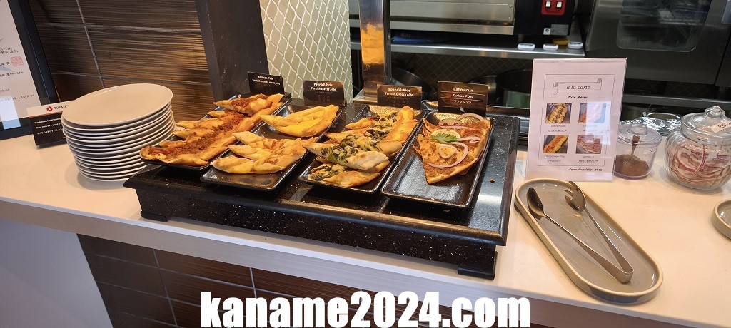 ピデ(Pide):トルコ風の薄く延ばした生地に具をのせて焼いたトルコ風ピザ風料理。ラウンジ内にピデ用のオーブンが設置されており、そこで焼き立てのピデが数種類提供されていました。